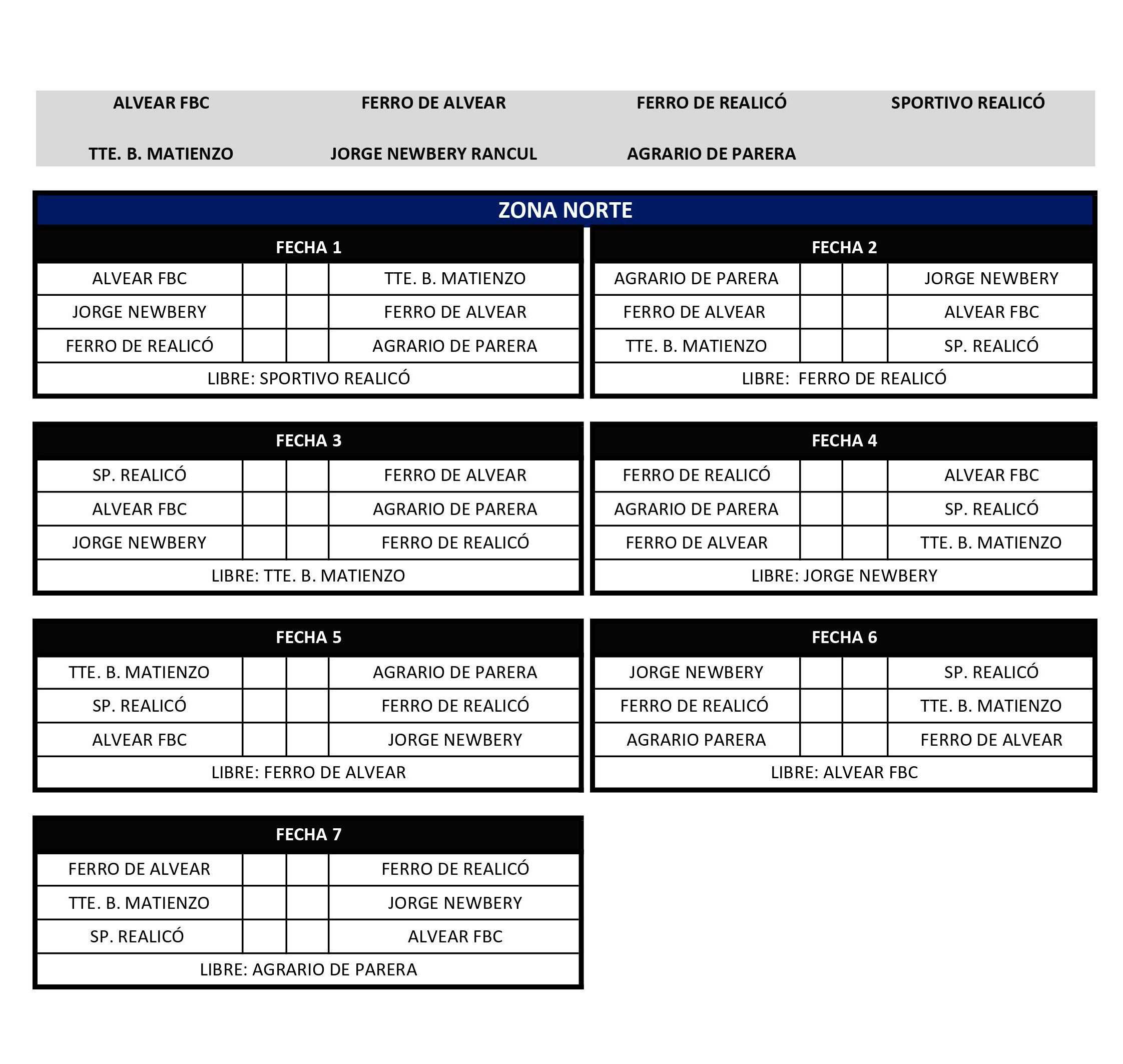 Se sorteó el fixture completo de primera división y en la Zona Norte el clásico de Alvear se disputará en Cancha del verde que recibirá al azul en la segunda fecha, al igual que Agrario será local de Jorge Newbery, mientras que el clásico de Realicó, será en cancha de Sportivo recibiendo a Ferro en la quinta fecha.