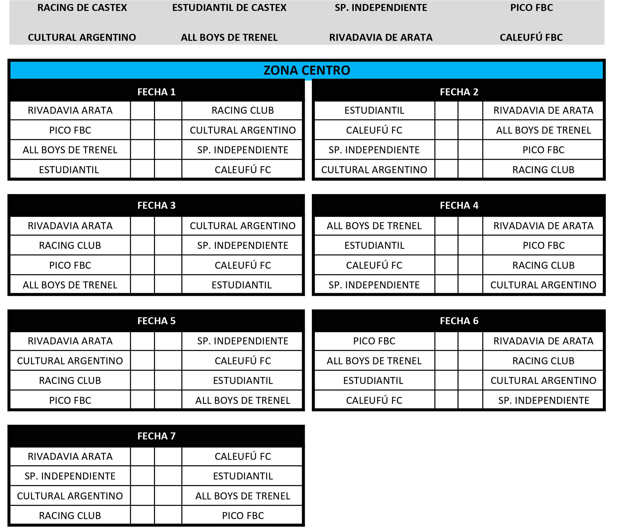 Por la zona centro, Racing y Estudiantil se medirán en la quinta fecha en cancha del albo, Sp. Independiente en la segunda fecha recibirá en la Villa Sportiva a Pico FBC, y en la séptima Caleufú FC. recibirá a Rivadavia de Arata.