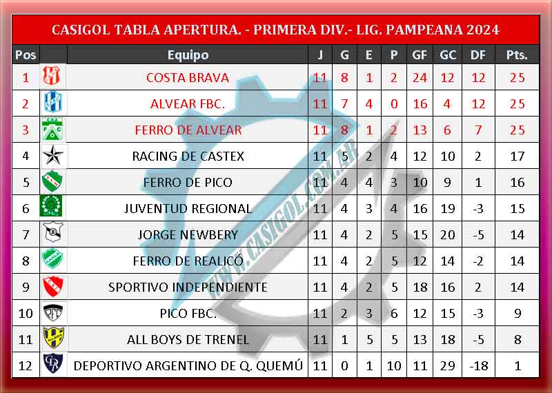 Tarde gris, con llovizna en toda la zona donde se disputó la úlimta fecha del torneo Apertura de fútbol, en la cual ganó Costa, también lo hizo Alvear en el clásico, Independiente se impuso de visitante ante All Boys, Racing y Pico igualaron en Castex, Juventud Regional hizo lo propio con Ferro y también fue empate en Rancul Jorge Newbery y Ferro de Realicó.
