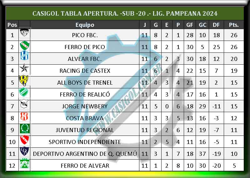 Finalizadas las once fechas de la categoría preliminar, igualaron en el primer lugar Pico FBC y Ferro de Pico. El reglamento indica que deben jugar un encuentro para desempatar en cancha neutral, por lo tanto mañana lubes, se resolverá en consecuencia en la reunión de Liga Pampeana de fútbol.