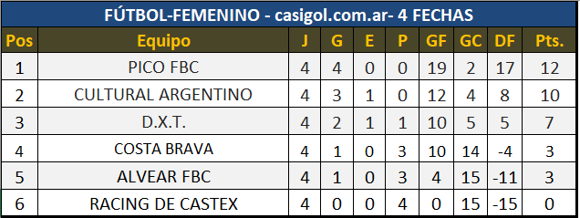 En el "Hector Nervi", se disputó la cuarta fecha del torneo de fútbol femenino, en el cuál se enfrentaron en primer turno, el local Rácing Club ante uno de los protagonistas principales de este torneo como lo es Cultural Argentino, en segundo turno se enfrentaron  Costa Brava con el líder Pico FBC y cerraron la jornada las chicas que representan al club DXT enfrentando al representativo de Alvear FBC.