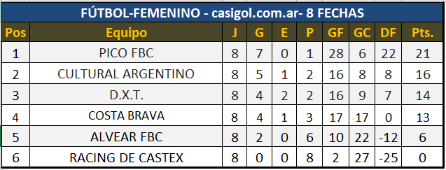 Se jugó la octava fecha del torneo de futbol femenino en el cuál se enfrentaron en el estadio olímpico en primer turno Costa Brava vs. Cultural Argentino, luego Alvear hizo propio con Rácing de Castex y finalmente