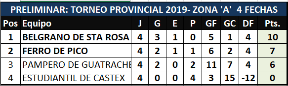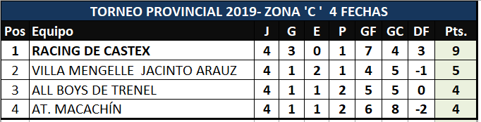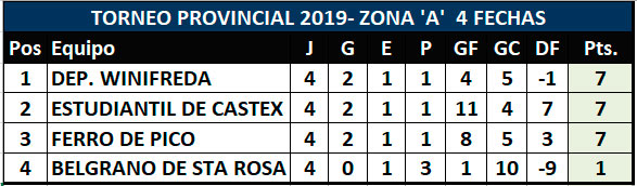 En la tarde de hoy se completó la cuarta fecha del torneo provincial "Clubes con Historia", en la cuál ganó Ferro en el "coloso", ante Belgrano, Costa goleó a All Boys y se tomó revancha en el "Pacaembú". Racing ganó y empató All Boys de Trenel ante Villa Mengelle, Cultura Integral consiguió su segunda victoria consecutiva, mientras que Sp. Independiente continúa su invicto al ganar en Guatraché, y por la zona E, cayó Alvear en Doblas y empató Ferro de Alvear ante Rivera.