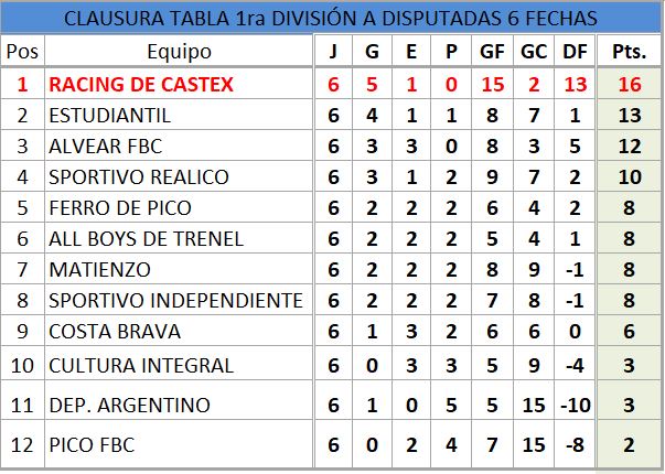 TABLA DE POSICIONES PRIMERA DIVISIÓN