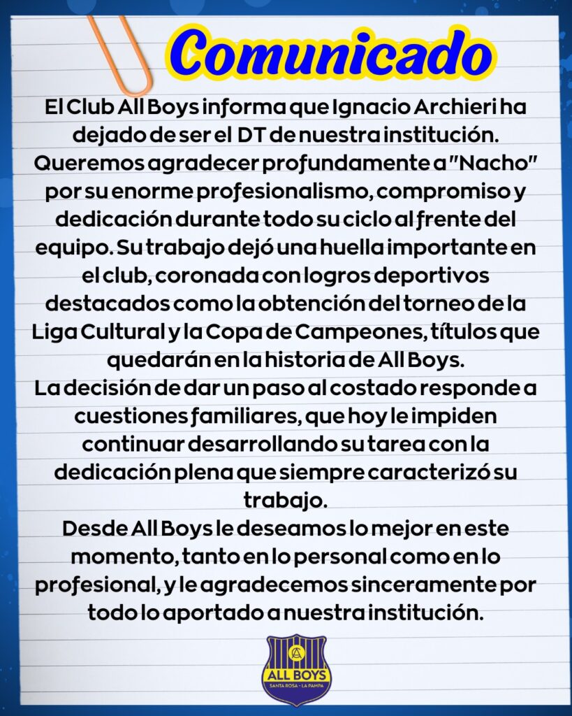 El club All Boys de Santa Rosa hizo público un comunicado en el cual expresa que Ignacio Archieri Director Técnico del club capitalino en toda la temp0rada, a dejado de serlo.