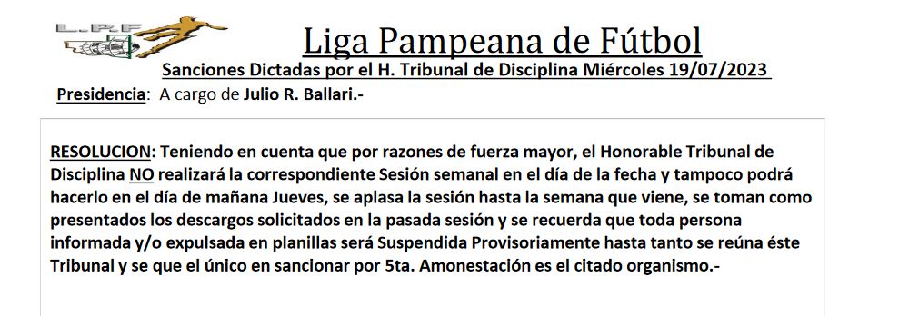 Liga Pampeana de fútbol informó a través de un boletín en su sección del tribunal de disciplinas, en la cuál indica que por razones de fuerza mayor no se pudieron reunir esta semana, por lo tanto todas las persona que hayan sido expulsadas o informadas por planilla, serán suspendids de manera provisoria, hasta tanto se reuna el tribunal, y hace referencia a que el único en sancionar por quinta amarilla es el citado organismo, por lo tanto quienes hayan llegado a la quinta tarjeta amarilla, podrán jugar hasta tanto no sean suspendidos por boletín oficial del tribunal de disciplinas.