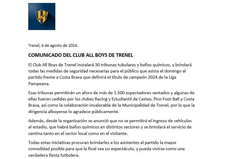 El club All Boys de Trenel, emitió un comunicado oficial, en el cual hace mención que instalará 30 tribunalas tubulares, baños químicos y brindará todas las medidas de seguridad necesarias para que el público pueda asistir con las comodidades necesarias  al "José Gago", el domingo en  la revancha de la final ante Costa Brava.