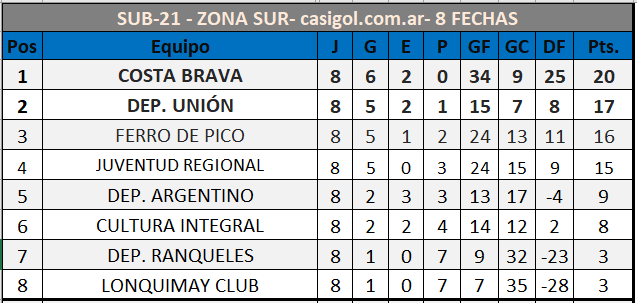 Se disputó la octava fecha del torneo de Liga Pampeana primera de las revanchas. La fecha tuvo once partidos de una fecha que comenzó ayer sábado con el empate cero a cero en el "Coloso" de Barrio Talleres entre Ferro de Pico y Dep, Argentino y la derrota por goleada de Juventud Regional en el "Fortunato Echeverría ante Dep. Ranqueles por cuatro a uno.