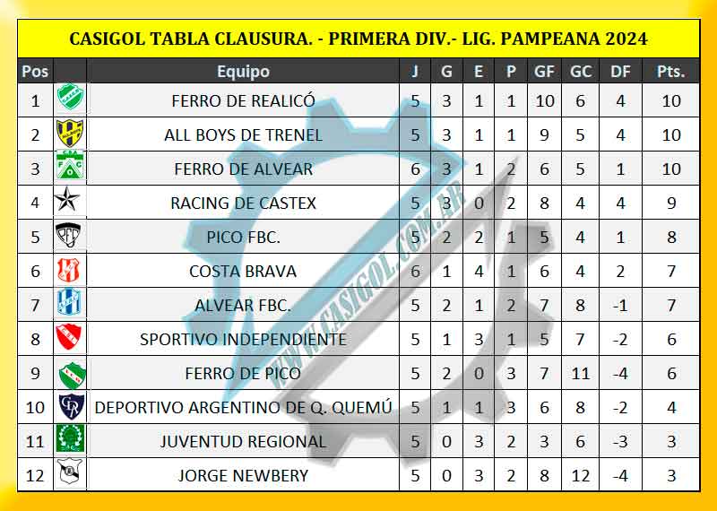 TABLA DE POSICIONES TORNEO CLAUSURA PRIMERA DIVISIÓN