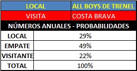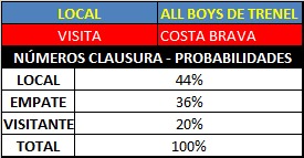 Pero bueno, ahora todo se invierte debido a que el local es All Boys, y los números que analizamos son otros, dado que en este caso lo hicimos tomando la efectividad en ataque de All Boys y en defensa  jugando de local y de la misma forma tomamos la efectividad en  ataque y en  defensa de Costa Brava jugando en calidad de  visitante.  Calculando esto podemos llegar a una probablidad cierta de un resultado posible según números de uno y otro.