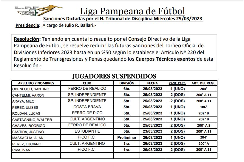 LIGA PAMPEANA DIFUNDIÓ LAS SANCIONES DE DIVISIONES INFERIORES Y TORNEO PREPARACIÓN