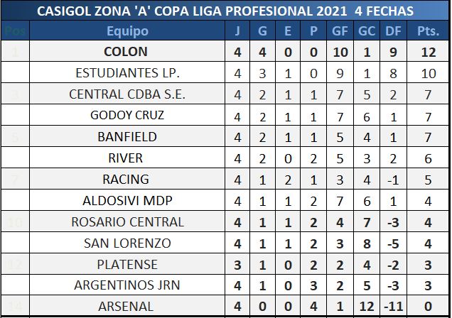 Culminó la cuarta fecha de la Liga Profesional de fútbol, en la cuál en el día de hoy se disputaron dos encuentros. En primer turno Racing derrotó a Rosario Central por uno a cero con el gol de Copetti, y en segundo turno River y Argentinos Jr igualaron sin abrir el marcador.