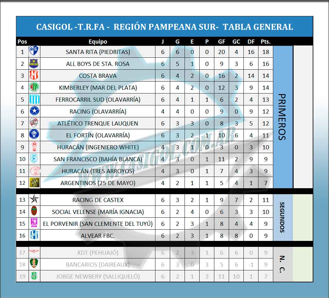 En la tarde de hoy se definen los  16 clasificados de la Región Pampeana Sur. Hasta el momento hay 15 ya definidos, solo resta, uno y ese saldrá de Alvear FBC o KDT.