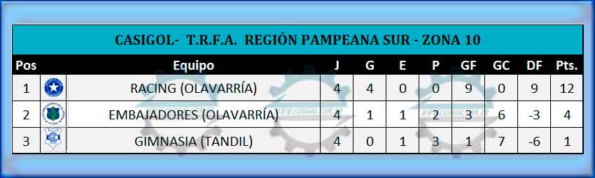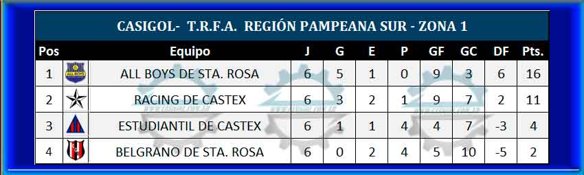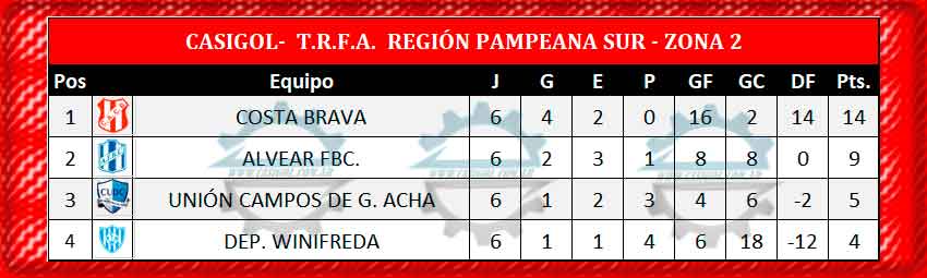 De esta manera se clasificaron los cuatro equipos pampeanos para la siguiente fase. Alvear FBC y Costa Brava zona 2, All Boys de Sta Rosa y Racing de Castex zona 1.