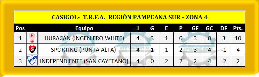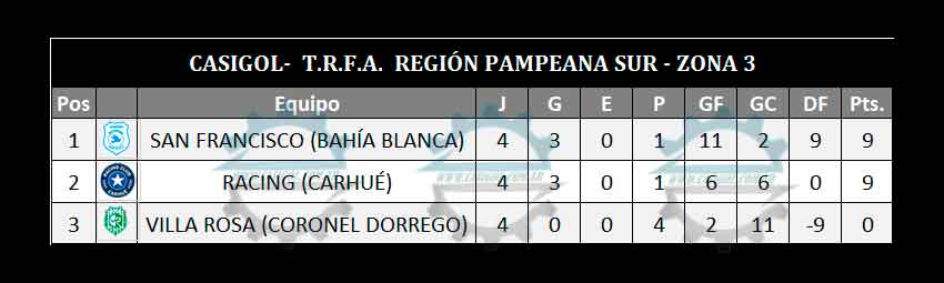 Nota: San Francisco es líder porque en los partidos disputados entre ellos ganó San Francisco (Bahía Blanca) por tre a cero  y perdió dos a uno lo que hace un global de cuatro a dos favorable al conjunto de Bahía Blanca.