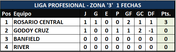 Por la misma zona en el día de ayer Rosario Central se impuso a Godoy Cruz por dos a uno y el "Canalla" sumó los tres puntos y hasta que se juegue el encuentro de hoy entre River y Banfield es el único líder de la zpona 3
