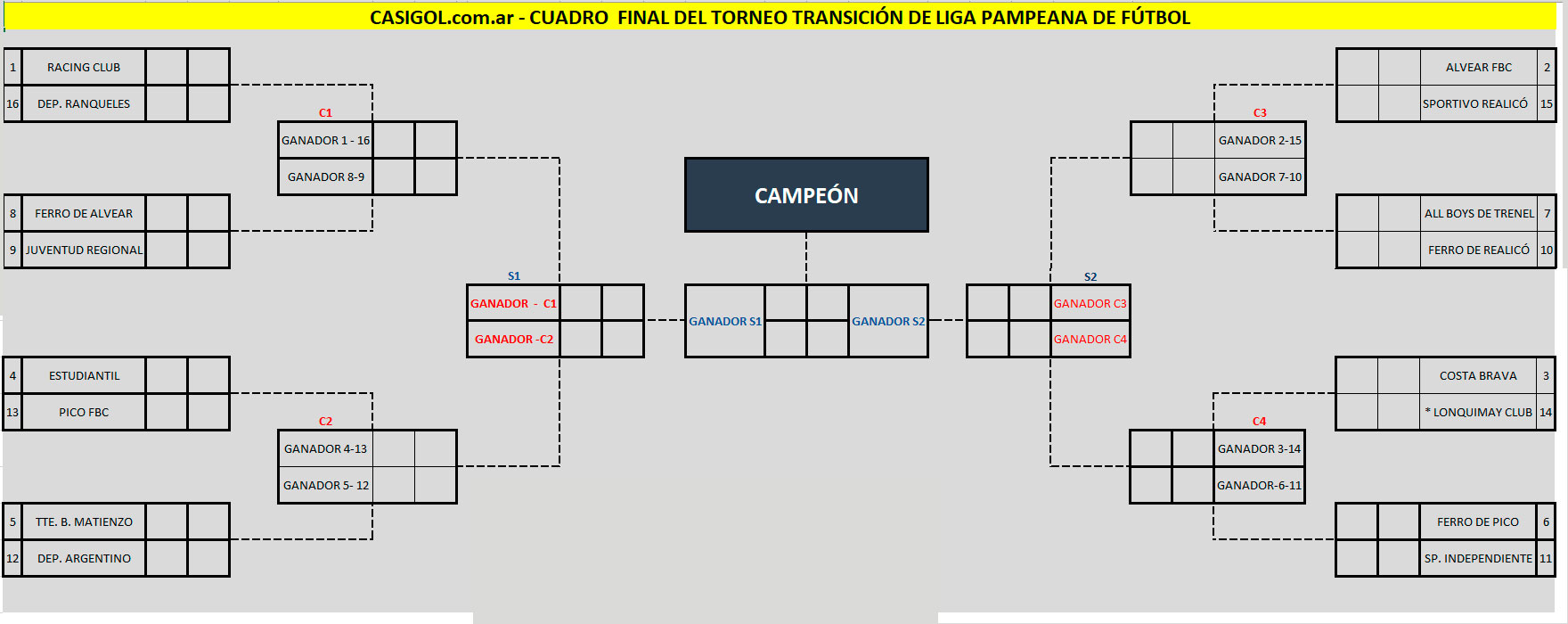Quedan dos fecha para finalizar la fase regular en las tres zonas del torneo transición de Liga Pampeana de fútbol. Sabemos que serán 16 los equipos que clasificarán a octavos de final y que el cuadro final está prearmado. Nosotros quisimos ver como quedaría el cuadro y que cruces podrían darse. Costa y Ferro van por el mismo lado del cuadro y se podrían cruzar en cuartos de final, en tanto que el clásico de Castex podría darse en semifinales, el clásico de Realicó se podría dar en cuartos y Alvear y Ferro de Alvear chocarían en una final. En fin muchas hipótesis podrían darse pero aún faltan dos fecha y todo está por definirse.