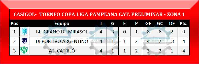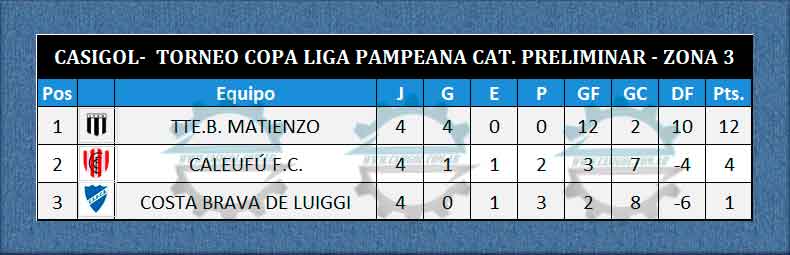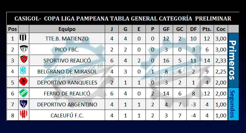 Nota: Igualan en cociente en la primera posición Pico FBC y Tte. B. Matienzo y en el séptimo lugar Deportivo Argentino y Caleufú FC.  en tal caso habrá sorteo para determinar quien es primero, segundo, séptimo y octavo, por lo tanto el cuadro de cuartos de final estaría con el siguiente potencial en el partido1 y en el partido 2, hasta que se determinen dichas posiciones.
