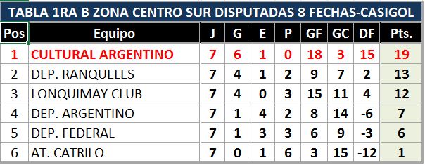 Se disputó una nueva fecha del torneo de fútbol de primera "B". La misma había iniciado con el encuentro que disputaron en Quemú, el conjunto local y Cultural Argentino igualando en uno. La síntesis del resto de la jornada es la siguiente: