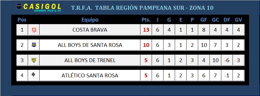 Hoy se completó la sexta fecha del torneo T.R.F.A. donde por la zona 10 Costa Brava y  All Boys de Santa Rosa,  se metieronen la segunda fase buscando un ascenso al Federal "A".