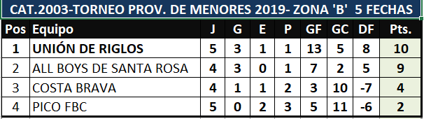 Anoche en el adelantado de la quinta fecha del torneo provincial de Juveniles "Clubes con Historia", igualaron en dos tantos por lado Unión Deportiva Riglos y Pico FBC, marcando para el local Franco Alejo y Bruno Cepeda, en tanto que para el conjunto decano de nuestra ciudad convirtieron Agustín García y Pablo Mansilla. Con este resultado el conjunto de Riglos queda como único líder de la zona "B" a la espera del resultado que se dará hoy en el "Nuevo Pacaembú", donde Costa Brava recibe a All Boys de Santa Rosa.