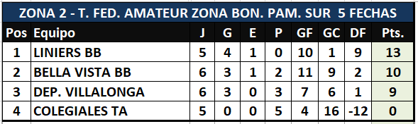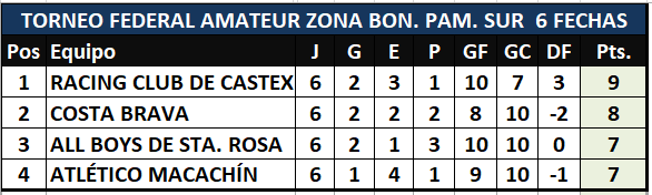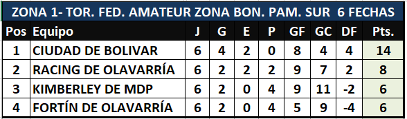 Se disputó la sexta y última fecha del torneo Regional Amateur, en la Región Pampeana sur por las zonas 1, 2 y 3 se conocieron los seis clasificados que continuarán en la segunda fase.   Por la zona 1  los clasificados son Ciudad de Bolivar y Racing de Olavarría, por la zona dos están adentro Liniers de B. Blanca y Bella Vista de B. Banca y en la zona tres Costa Brava y Racing club de Castex, continuarán en el torneo en la segunda fase.