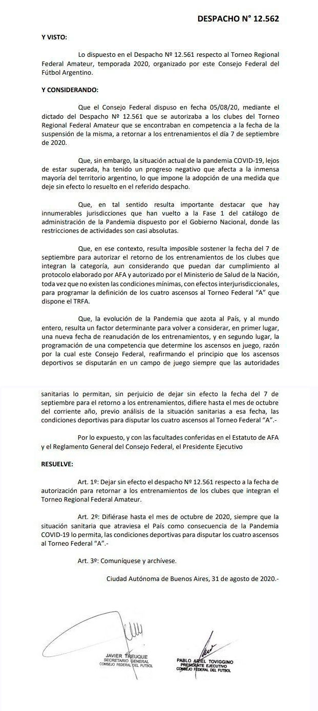 Con fecha 31 de Agosto el consejo federal de fútbol dio a conocer un nuevo despacho (12562), en el cuál rectifica lo expresado anteriormente en el despacho nro 12561. respecto a la vuelta a los entrenamientos en el torneo Regional Amateur. Debido al rebrote de Covid 19 posterga el inicio de los entrenamientos para el Mes de Octubre del 2020 siempre y cuando la situación de la pandemia mejore.