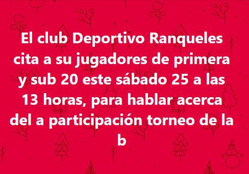 El club Deportivo Ranqueles citó para hoy a la hora 13, a sus jugadores de primera división y sub 20, para una charla acerca de la participación del conjunto naranja en la divisional de ascenso. En principio la versión oficial que el club difundió en sus redes sociales, es que se decidiría en la misma los pasos a seguir, pero alguna versiones de fuentes allegadas al club, aseguran que el conjunto naranja será de la partida y que incluso ya estaría decidido quien sería el entrenador, aunque no trascendieron los nombres de quienes conducirían técnicamente al club naranja. No obstante ojalá este club tan popular de nuestra ciudad, sea de la partida, dado que es una barriada muy importante que acompaña permanentemente con su colorido y es uno de los animadores permanentes del ascenso.