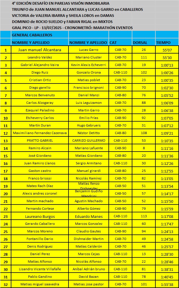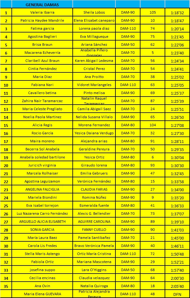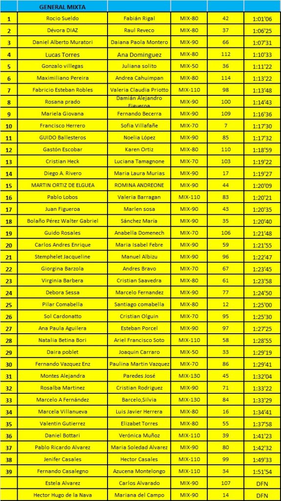 En el parquer recreativo "Delfín Pérez" se llevó a cabo una competencia de Running, en la modalidad de 15K. denominada "Desafío de parejas". La misma se llevó a cabo en el día de ayer y los resultados que se registraron en la misma son los siguientes: