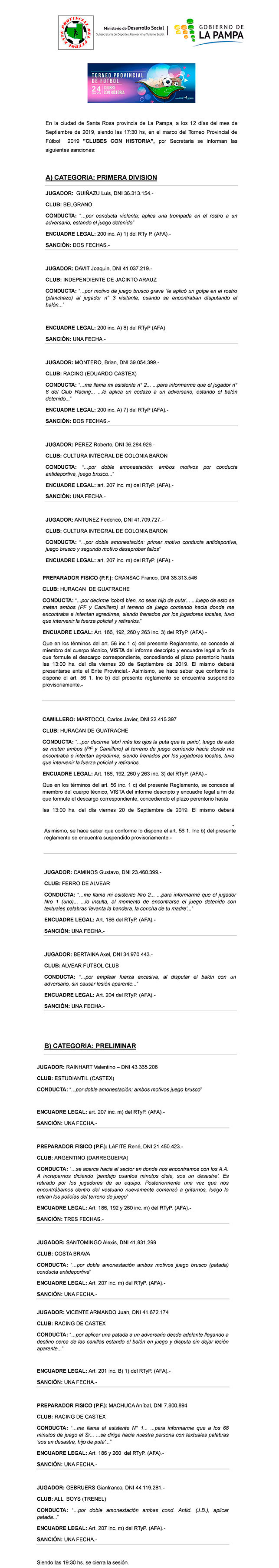 El Ente provincial del fútbol dio a conocer las sanciones del torneo provincial tras disputarse la primera fecha. Las sanciones abarcan tanto a los encuentros disputados por primera división y los de categorías Juveniles. El siguiente es el informe oficial de las sanciones.