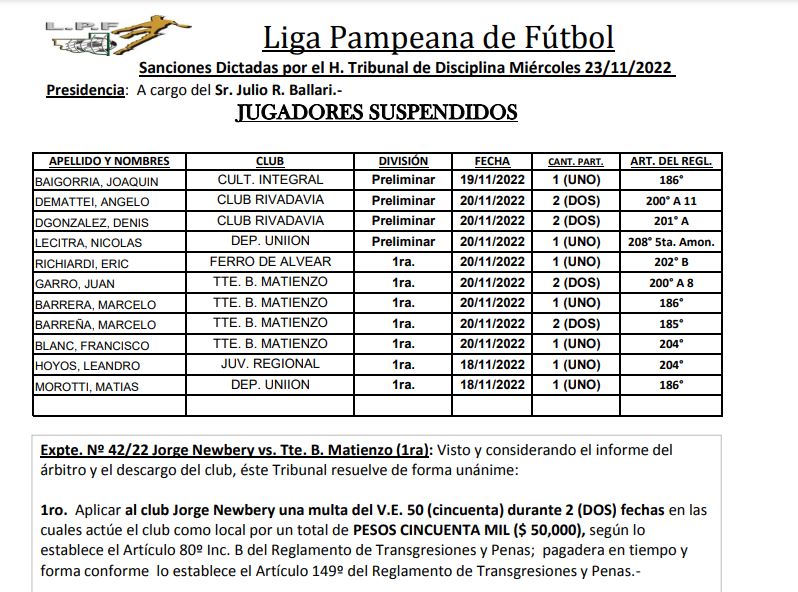 SANCIONES DEL TRIBUNAL DE DISCIPLINAS DE LIGA PAMPEANA DE FÚTBOL 23 de noviembre de 2022 CompartirSe conocieron las sanciones del tribunal de disciplinas de Liga Pampeana de fútbol. ESTO TE PUEDE INTERESAR:SE CONOCIERON LOS FIXTURE DE DIVISIONES INFERIORESAMISTOSOS Y PUESTA A PUNTO: LOS EQUIPOS AJUSTAN DETALLESCOSTA BRAVA PRESENTÓ A SU PLANTEL EN CONFERENCIA DE PRENSARACING CONFIRMÓ Y EL TORNEO DE VETERANOS TOMA COLORRACING CAMPEÓN DEL TORNEO DE VETERANOS EN CALEUFÚASCENSO: AMISTOSO CON BUEN RITMO EN EL MANUEL RODRÍGUEZCompartir
