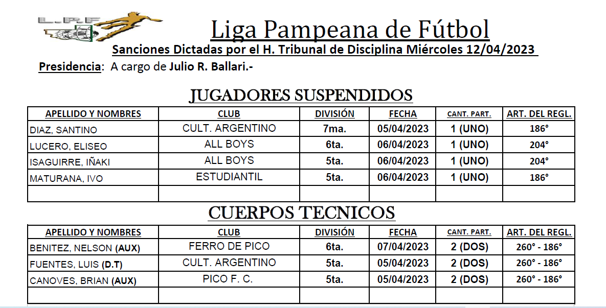 SANCIONES DEL TRIBUNAL DE DISCIPLINAS DE LIGA PAMPEANA DE FÚTBOL