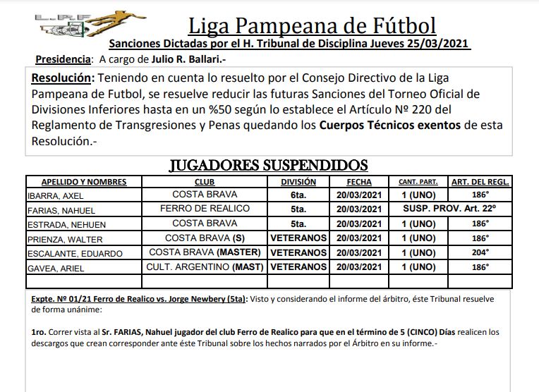 El tribunal de disciplinas de fútbol de Liga Pampeana dio a conocer las sanciones de la primera fecha del torneo de divisiones inferiores y del torneo de veteranos. Las mismas son las siguientes: