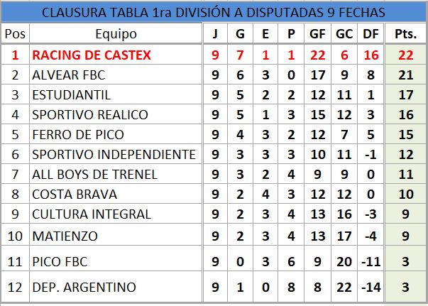 Se completó la novena fecha del torneo clausura de fútbol de Liga Pampeana, que había comenzado con el empate entre Ferro y Costa en el adelantado del jueves. La síntesis de lo acontecido en la novena del clausura es la siguiente: