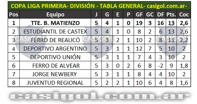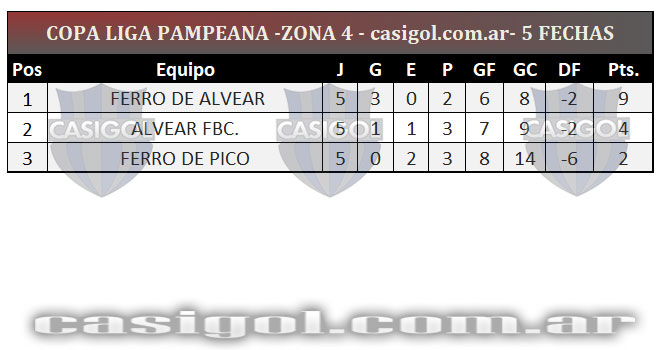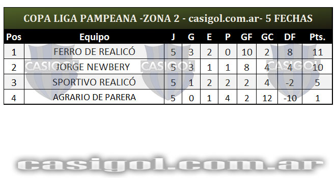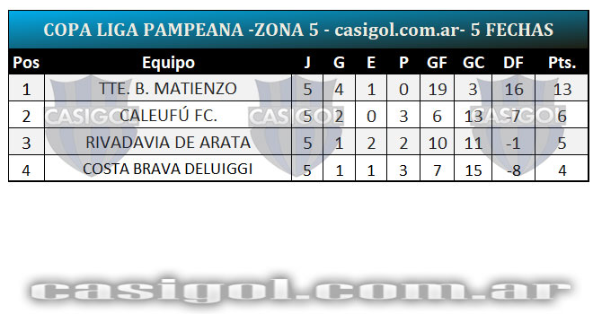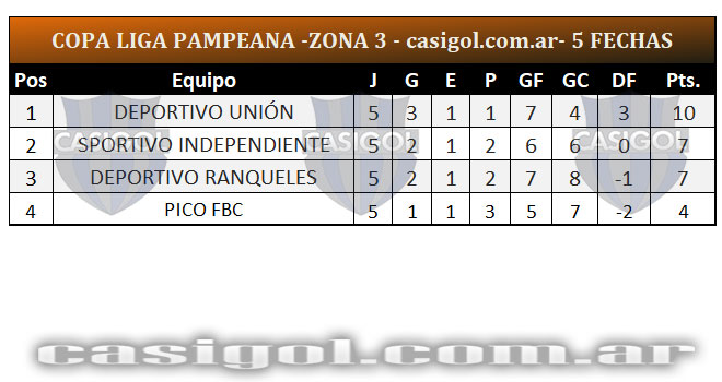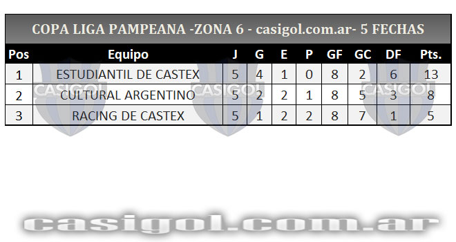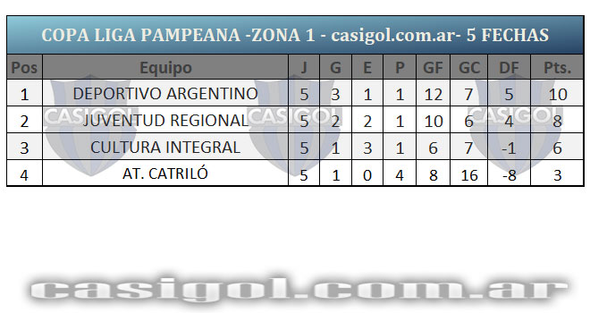 Se completó la quinta fecha del torneo Copa Liga Pampeana que tuvo dos adelantados con el triunfo de Estudiantil por el inter zonal entre zonas 4 y 6 y el empate entre Sportivo Independiente y Deportivo Unión. Cuando falta una fecha para que se conozcan los clasificados así quedaron encolumnados por zonas y la general.
