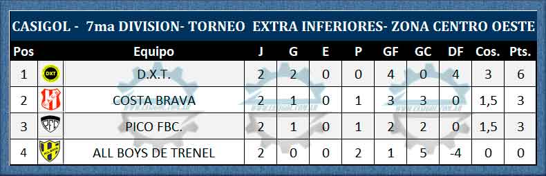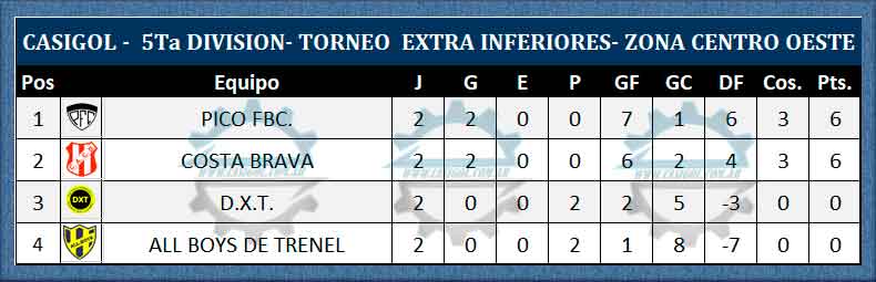 En la tarde noche de hoy se completó la segunda fecha del torneo extra de divisiones inferiores con los encuentros de las tres categorías que disputaron Pico FBC y All Boys de Trenel por la zona centro Oeste. Las contiendas se llevaron a cabo en el "Emiliano Luis Cayre" cuando en primer turno por séptima división Pico FBC. derrotó a All Boys de Trenel por dos a uno, la jornada continuó con el empate en dos tantos por lado en sexta división y ya cerca de la media noche finalizó con el encuentro de quinta en el cuál el "decano" goleó al conjunto de Trenel.
