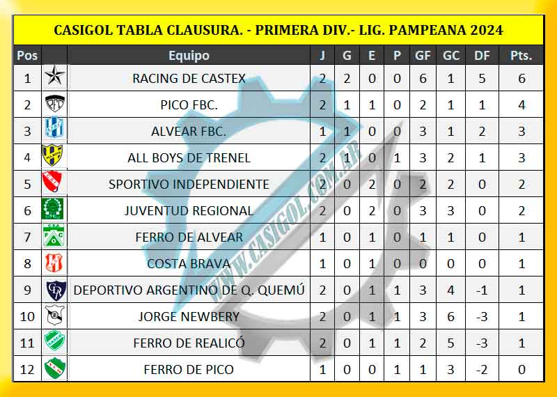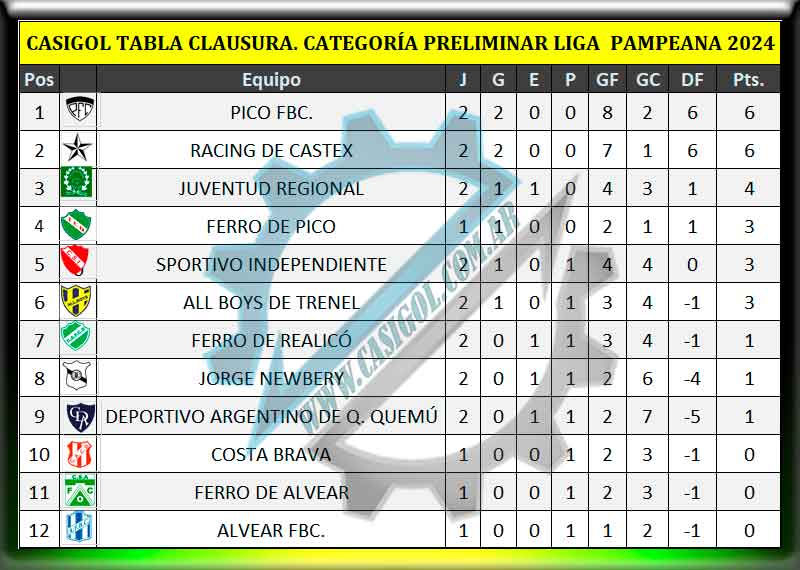 En el día de hoy se cmpletó la segunda fecha del torneo clausura de fútbol de primera división. La misma había comenzado en el día de ayer con la derrota de Ferro de Pico tres a uno en Intendente Alvear.
