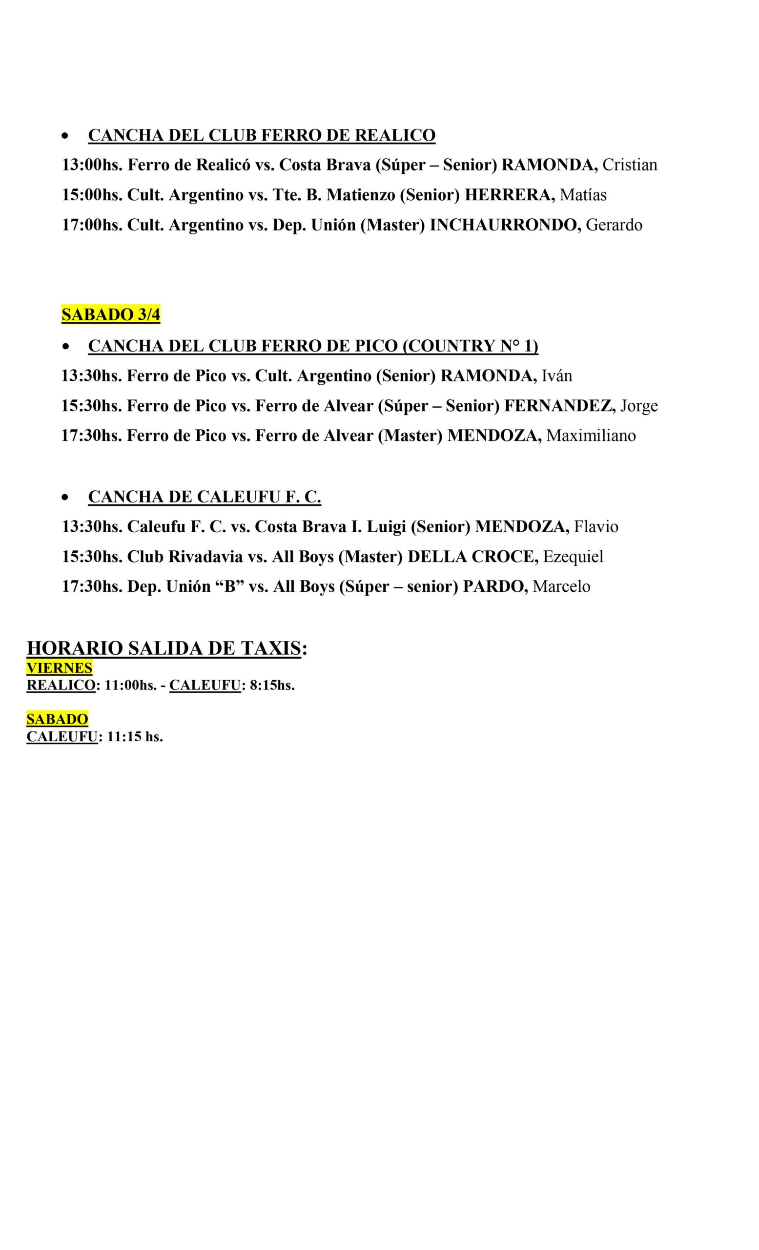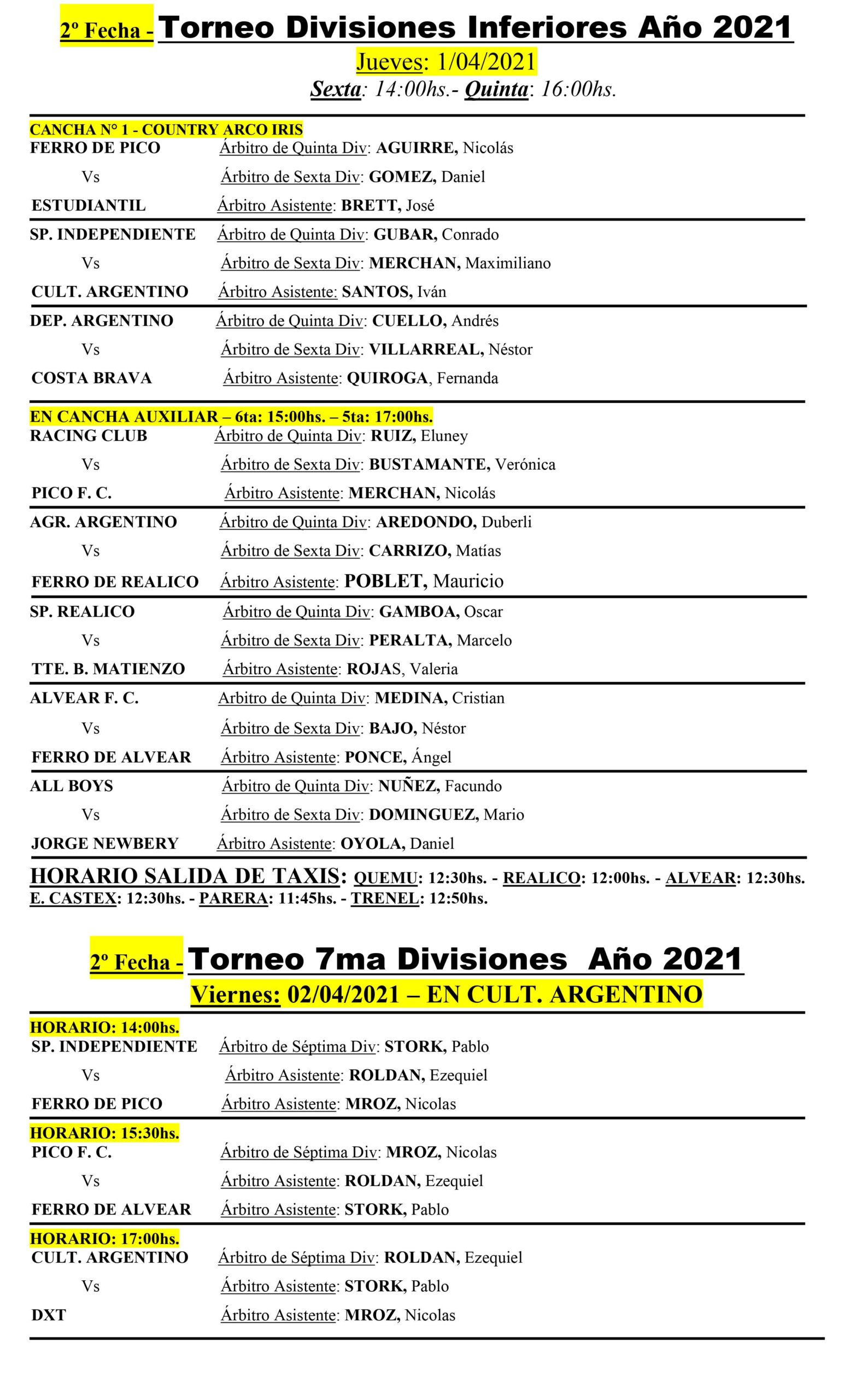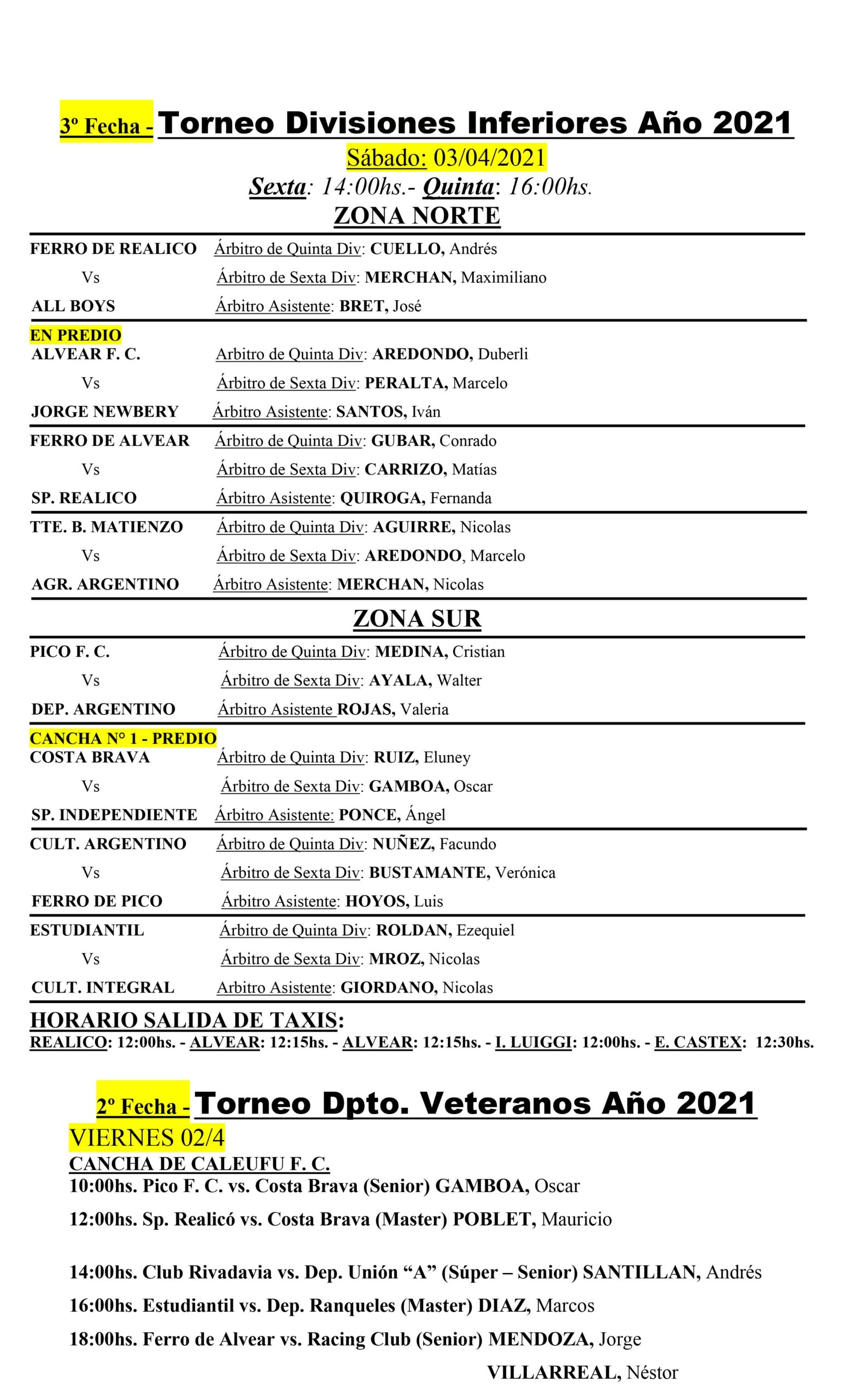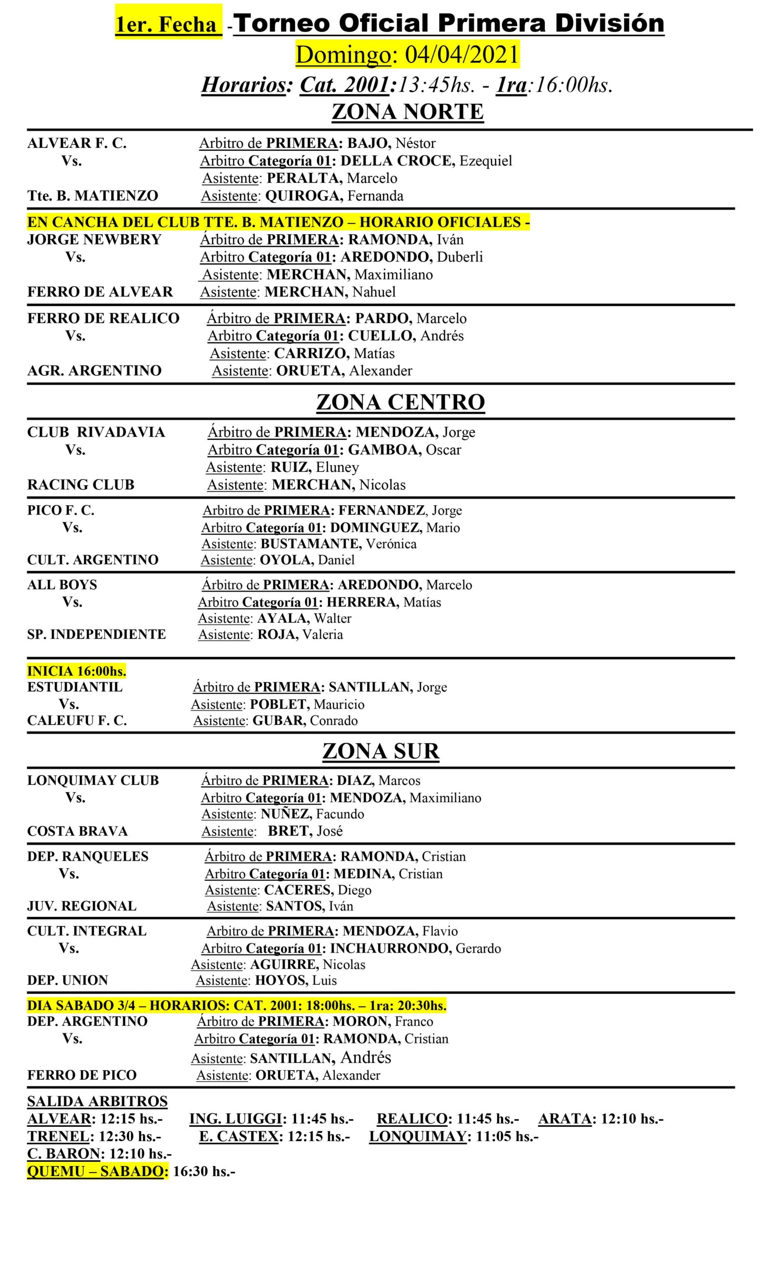 Hace instantes se conocieron las designaciones arbitrales para la jornada de fútbol de fin de semana que dará comienzo hoy con la segunda fecha de divisiones inferiores para categorías sexta y quinta, proseguirá mañana viernes con Séptima división y el inicio de la segunda de veteranos, el sábado irá la tercera de quinta y sexta y se completará la fecha de veteranos y comenzará la primera división con el encuentro en Quemú entre Dep. Argentino y Ferro de Pico y el domingo se completará la primera fecha de primera división. y sub 21.
