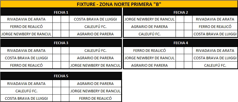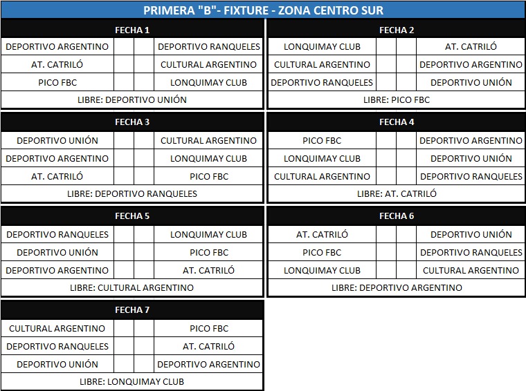 Hace instantes en sede de Liga Pampeana se conocieron los fixture para la primera "B". En estos momentos se está resolviendo la fecha de inicio de dicho torneo. Compartimos con ustedes los fixture para la zona centro sur que tendrá siete equipos y la zona norte que contará con ocho equipos. El torneo será a dos ruedas la la segunda se invertirán las localías.