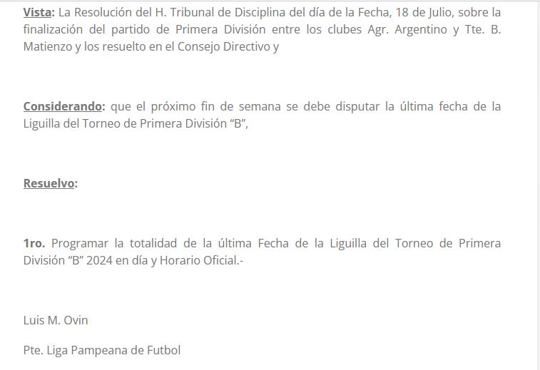Hace instantes el tribunal de disciplinas de Liga Pampeana dio a conocer las sanciones, entre las cuales dio por perdido el partido a Agrario y por tal motivo como lo habíamos adelantado en nuestra editorial del pasado lunes, Tte. B. Matienzo suma tres y jugará el domingo el ascenso ante Estudiantil. El Presidente de Liga Pampeana Luis Ovin, emitió un comunicado oficial en el cual indica que tras dicha resolución, se programa la fecha del ascenso, para el día domingo en horario oficial. O sea los partidos irán a partir de las 15:00hs. en las tres canchas.