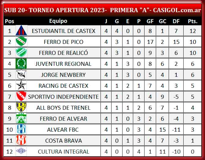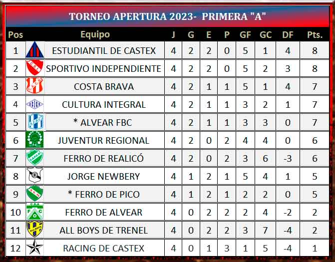 Nota. Pusimos el punto en Alvear FBC y Ferro de Pico, pero recordamos que tienen que completar su partido cuando igualaban cero a cero en siete minutos de juega de la fecha tres.