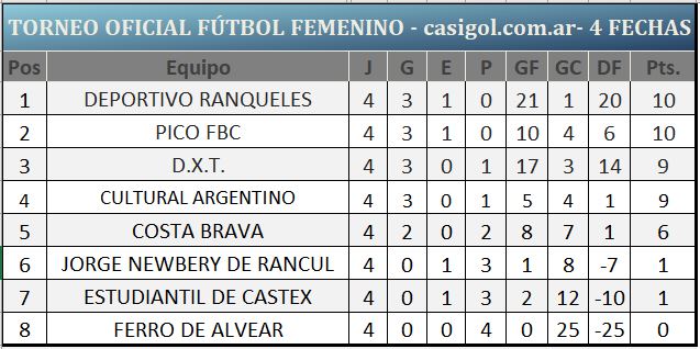 Se disputó la cuarta fecha del torneo de Liga pampeana de fútbol femenino. La jornada se llevó a cabo integramente en el predio "Pedro Constantini" de Costa Brava con los cuatro partidos correspondientes.
