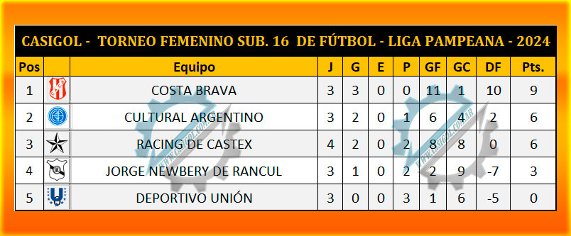 Se disputó la cuarta fecha del torneo femenino de fútbol para la categoría sub 16. La misma se llevó a cabo con dos partidos que se disputaron en cancha del Deportivo Unión donde en primer turno Costa Brava derrotó cinco a uno a Racing de Castex y a contuación  Jorge Newbery derrotó por uno a cero al local Deportivo Unión.  Tuvo libre Cultural Argentino