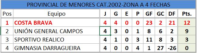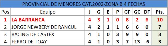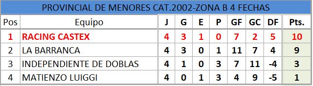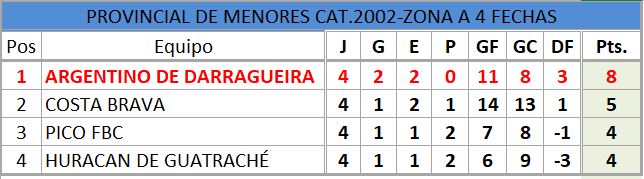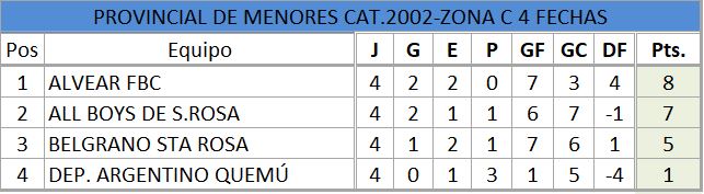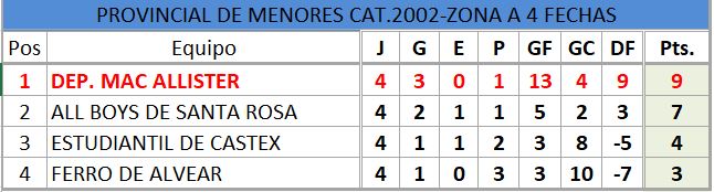 Se disputó la cuarta fecha del torneo provincial de fútbol, de divisiones inferiores, estos fueron los resultados, así quedó la tabla de posiciones, con la siguiente próxima fecha..