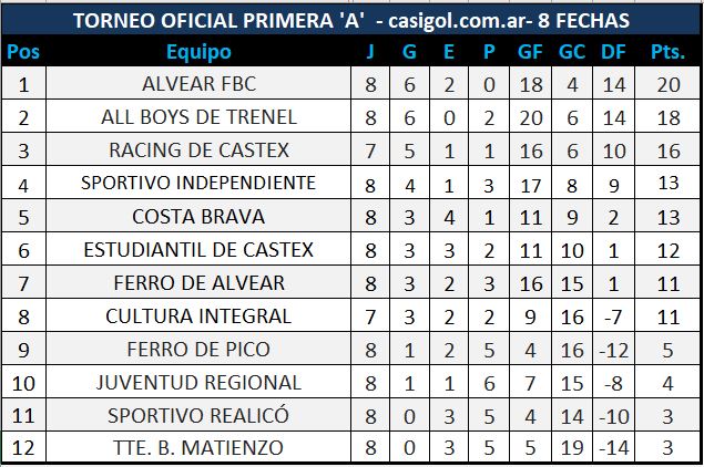 Se disputó la octava fecha del torneo Apertura de fútbol de Liga Pampeana con los siguientes resultados, la tabla quedó conformada de la siguiente manera y lo que se viene para el domingo. Ganaron Alvear, Racing, All Boys Estudiantil y Cultura, igualaron Matienzo y Costa en el José Manuel Garay.