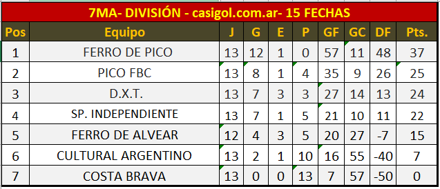 Se disputó la fecha 15 del torneo de séptima división de Liga Pampeana de fútbol primera de la tercera rueda. La misma se disputó en el "Luis Emiliano Cayre" con tres partidos. En primer turno Ferro derrotó por diez a dos a Cultural Argentino, en segundo turno en reñido partido DXT consiguió imponerse a Pico FBC y en tercer turno Sportivo Independiente dio cuenta del alicaído Costa Brava por cinco a cero, teniendo fecha libre Ferro de Alvear.