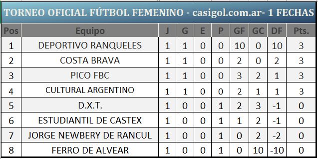 Se disputó la primera fecha del segundo torneo de la especialidad. La jornada se llevó a cabo en cancha de Estudiantil en Castex y la jornada la abrieron el local recibiendo a Cultural Argentino. En  segundo turno lo hicieron DXT con  el último campeón Pico FBC, luego continuaron uno de los debutantes Jorge Newbery cruzándose con Costa Brava y en último turno el cierre estuvo a cargo de Dep. Ranqueles y Ferro de Alvear.