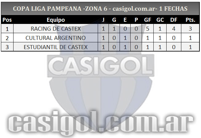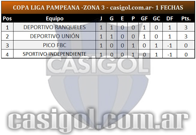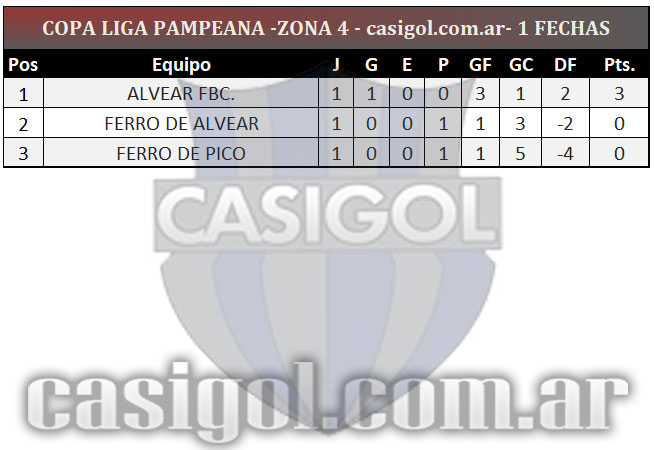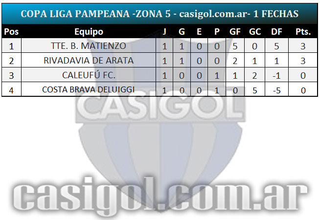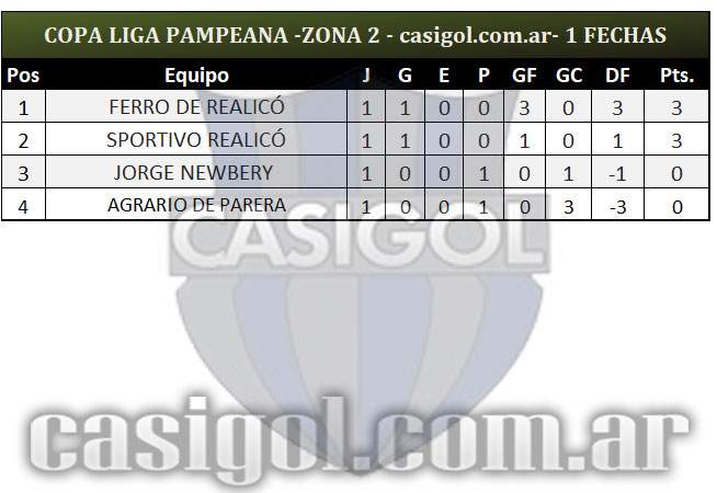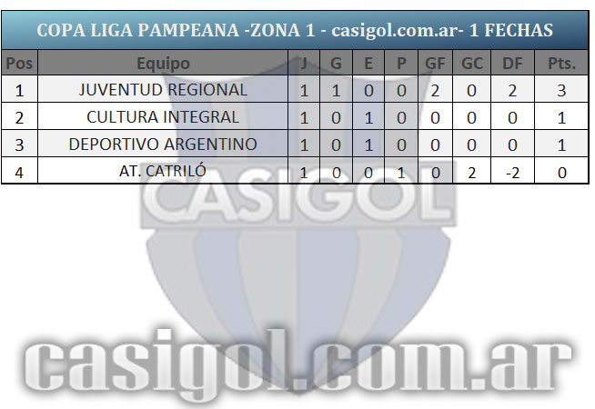 Se disputó la primera fecha del torneo Copa Liga Pampeana, "50 años de Radio 37" en sus seis zonas  que lo componen. La síntesis de lo sucedido es la siguiente: