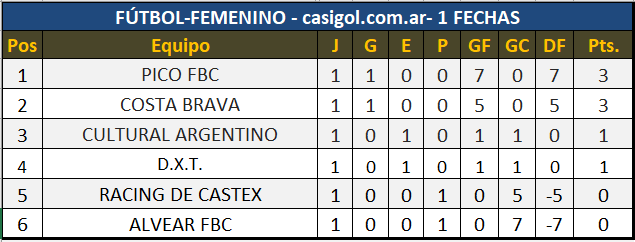 Tras la inauguración se disputó la primera fecha del torneo femenino de fútbol. En primer turno Cultural Argentino enfrentó a D.X.T. igulando uno a uno, en el segundo turno Pico FBC goleó a Alvear FBC por 7 a 0 y en tercer término Costa Brava