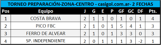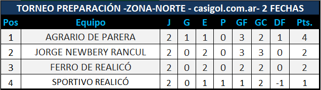 Se completó la segunda fecha del torneo preparación de fútbol de Liga Pampeana. Por zona centro Pico FBC recibió a Ferro de Alvear y por la Norte Agrario de Parera recibió a Jorge Newbery de Rancul y Ferro de Realicó en el cincuentenario se cruzó con Sportivo Realicó en el clásico del norte pampeano.